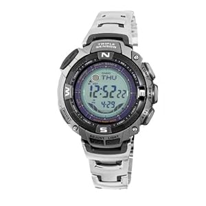 Perfect for rugged adventurers and weekend warriors, the solar-powered Casio Pathfinder men's sport watch is loaded with a digital compass and altimeter/barometer/thermometer--perfect for both mountain trekking and cave spelunking. It also includes tide and moon graphs and moon age data, and is very precise thanks to its atomic timekeeping features. The durable round watch case (measuring 50.5mm/1.98 inches wide) and bracelet are made of titanium, which is nearly 50 percent lighter than steel, but 30 percent stronger. It's also particularly resistant to salt water corrosion, as well as hypo-allergenic--perfect for those with metal allergies. The altimeter offers 5-meter measurements from -700 to 10,000 meters, and it can store altitude, month, date and time data, provide tendency and differential graphs, track cumulative ascent/descent, and sound an alarm when you reach a specified altitude. The watch also has a digital compass with 16 points of measurement displayed on the dial face. Other environmental and timekeeping features include: Barometer with atmospheric pressure tendency/differential graphics Thermometer World Time: 29 times zones (30 cities), city code display, daylight saving on/off 5 daily alarms 1/100 second stopwatch with 24-hour capacity and elapsed/split time modes and 1st-2nd place times Countdown timer with 60-minute range Auto Calendar (pre-programmed until the year 2099) This watch also features a ±20-second accuracy per month, Afterglow backlighting, and water resistance to water resistance to 200 meters (660 feet)--which will stand up to the rigors of recreational scuba diving. This solar-powered watch has a battery life of up to 5 months on a full charge (without further exposure to light). This multi-band radio-controlled watch receives a time calibration signal transmitted from several locations across the globe (the U.S., UK, Germany, and Japan), and it has an auto receive function (up to 6 times per day). You can choose to automatically receive this signal four times a day, or manually update the watch to the atomic clock.