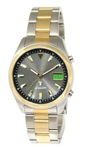 This Atomix Brand Atomic Watch is Solar Powered! Features a glass face with two hands and a stainless steel band in gold and silver. Gold markers show the hours, and a outer dial shows the minutes. A small LCD on the face of the watch shows the user the day of the week, day and month, seconds, or the battery level.